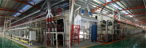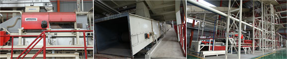 联合迪芬巴赫共同研发引进原装进口4头铺装机,芯层5盘式胶块分离装置抛辊,和4鼓条辊鼠笼式装置的组合,表层气流式+36轴机械粗细辊搭配组合铺装,使成品板材均质,表层平滑细腻;